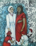 2016het werk is gemaakt voor de Stoppelhaene een oogstfeest in Raalte elk jaar is er een goed doel aan verbonden. Dit jaar een landbouwproject voor vrouwen en kinderen in Sri Lanka wat dit jaar 40,000euro heeft opgebracht.. Het is meegegeven naar Sri Lanka waar het nu hangt.