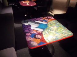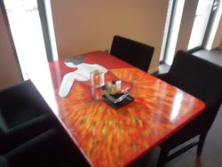 Deze tafels zijn door mij beschilderd en staan in de foyer van het Hoftheater in Raalte